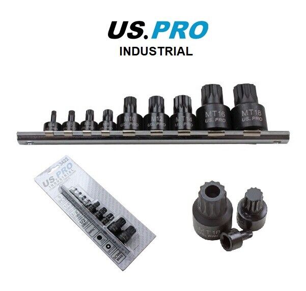 9PC 1/4" 3/8" 1/2" DR STUBBY IMPACT TRIPLE SQUARE BIT SOCKETUS PRO INDUSTRIAL impact triple square bit set, commonly used on VW, SEAT, AUDI ETC, includes the tamper proof MT14, MT16, MT18 bits used on oil drain plugs etc1/4" Drive Impact Triple Square Bit Socket 19mm L : M4, M5, M6, M83/8" Drive Impact Triple Square Bit Socket 29.4mm L : M10, M123/8" Drive Impact Tamper Triple Square Bit Socket 29.4mm L : MT141/2" Drive Impact Tamper Triple Square Bit Socket 38.1mm L : MT16, MT18Supplied on 190mm storage rail