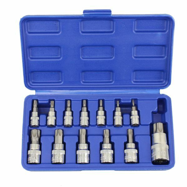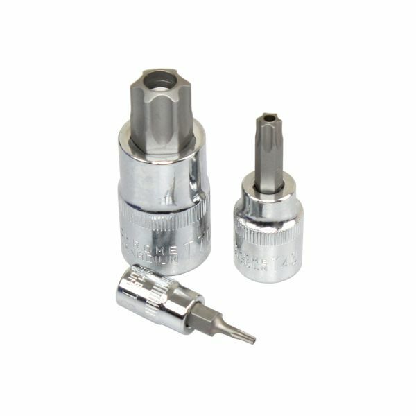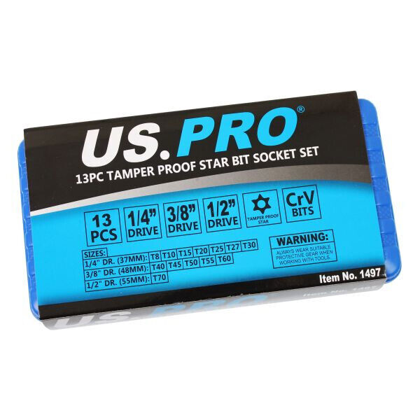 13PC TAMPER PROOF TORX BIT SOCKET SET13pc torx star bit socket set of star sockets, star bits and tamper star bits in 1/4", 3/8" & 1/2" Drive.7PC 1/4" DR (Length: 37mm) - T8, T10, T15, T20, T25, T27 & T305PC 3/8" DR (Length: 48mm) - T40, T45, T50, T55 & T601PC 1/2" Dr (Length: 55mm) - T70